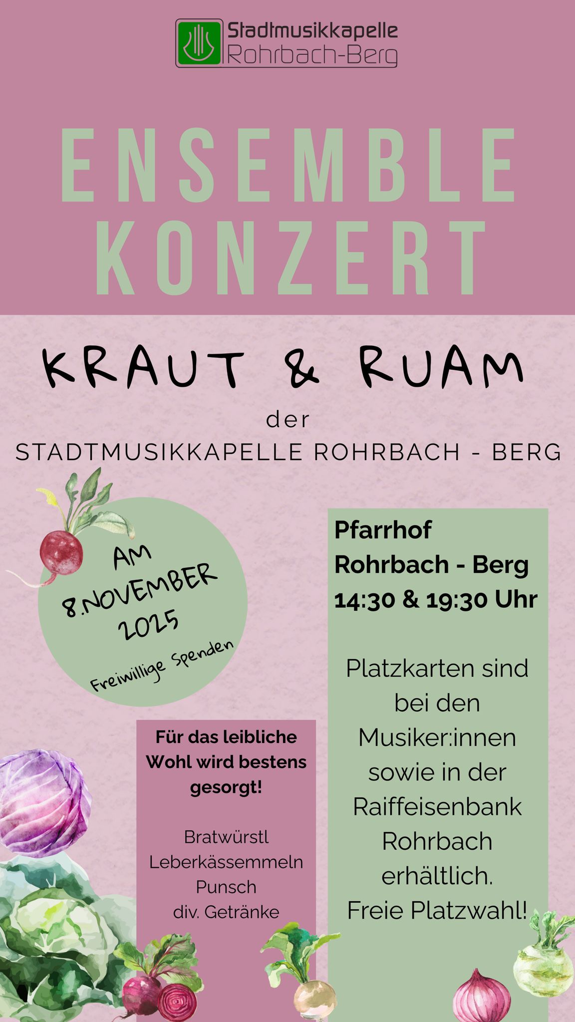 Die Stadtmusikkapelle Rohrbach-Berg lädt sehr herzlich zum Ensemblekonzert „Kraut und Ruam“ am 8. November 2025 um 14:30 & 19:30 Uhr in das Pfarrzentrum Rohrbach ein. Erleben Sie verschiedene Gruppen/Ensembles, die sich beim Spielen abwechseln und Euch mit den unterschiedlichsten Genres und Klängen begeistern. Wir freuen uns auf Euren Besuch! Eintritt: Freiwillige Spende Platzkarten sind...