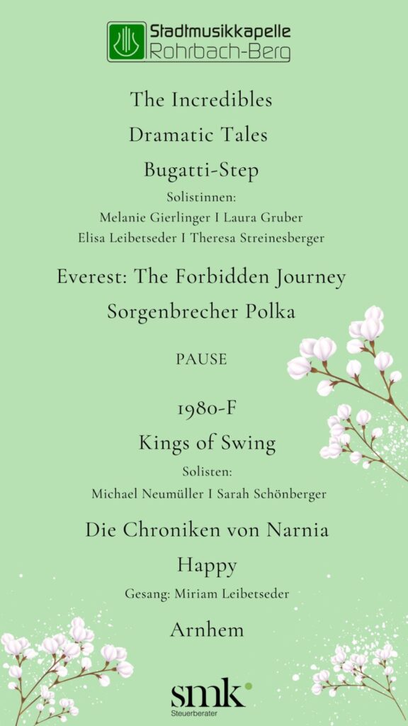 Wir, die Musikerinnen und Musiker der Stadtmusikkapelle Rohrbach-Berg, freuen uns sehr, Sie an diesem Abend begrüßen zu dürfen.